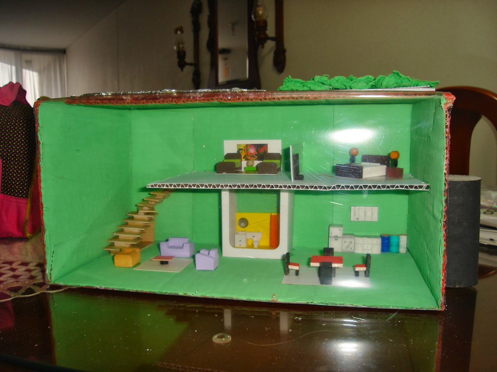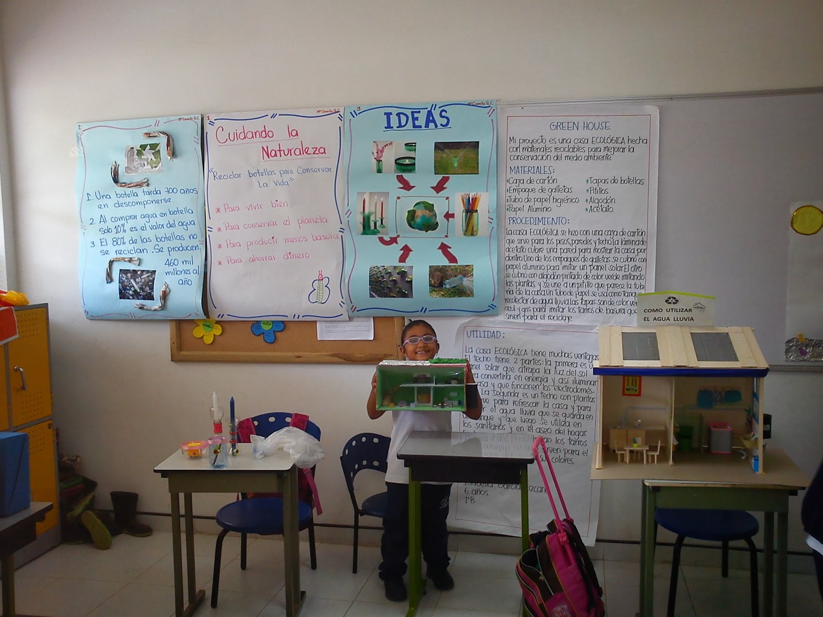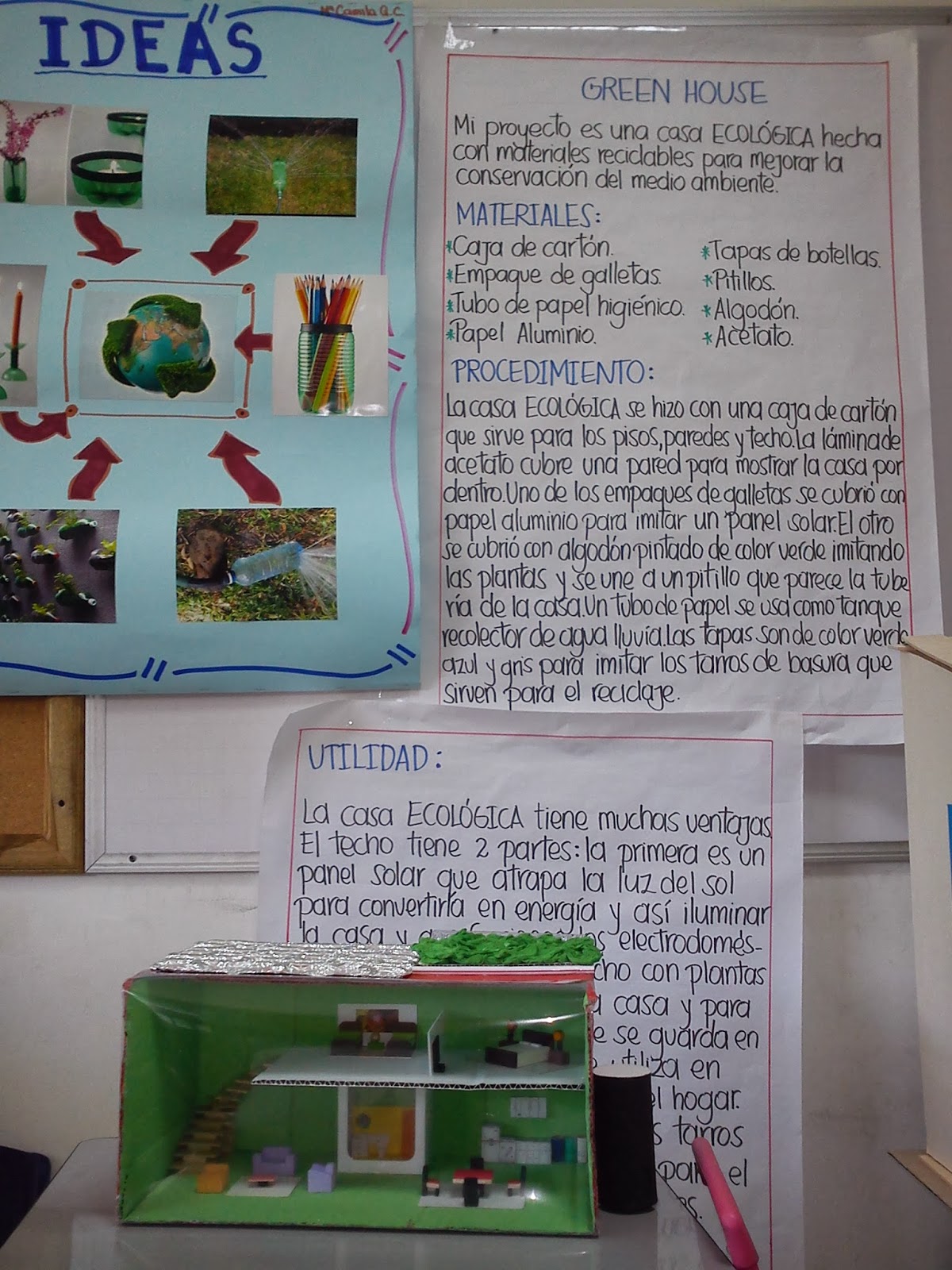 La maqueta de la casa ecológica utiliza materiales reciclables. Una caja de cartón sirve para los cimientos, la estructura y las paredes de la casa. La lámina de acetato cubre una de las paredes de la casa, para mostrar la casa por dentro. Uno de los moldes es cubierto con papel aluminio para servir como el panel solar. El otro molde es cubierto con algodón para simular las plantas; este molde tiene canales que se conectan con los pitillos. Estos pitillos son la tubería que lleva el agua filtrada por las plantas hacia la caneca recolectora. El tubo de cartón actúa como caneca. El resto de los accesorios se utilizan para el mobiliario de la casa: Sala, Dormitorio, Baño y Cocina. Por ejemplo, pintamos las tapas de botella para que queden como las canecas de basura ecológicas (Vidrio, Reciclable, Orgánicos, Otros).