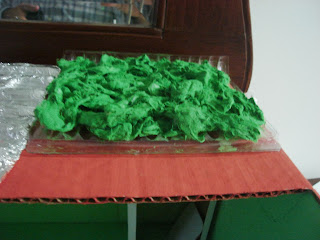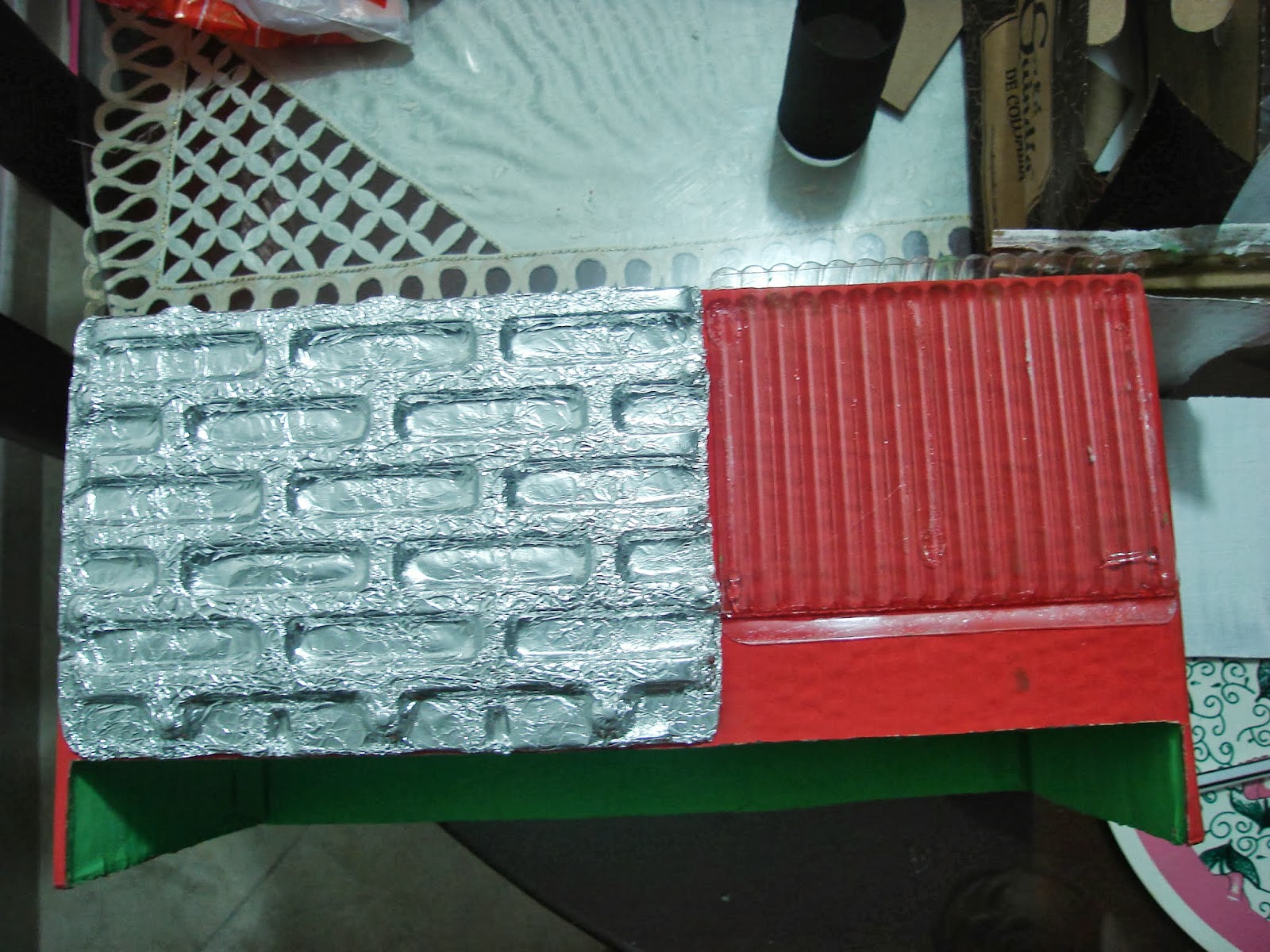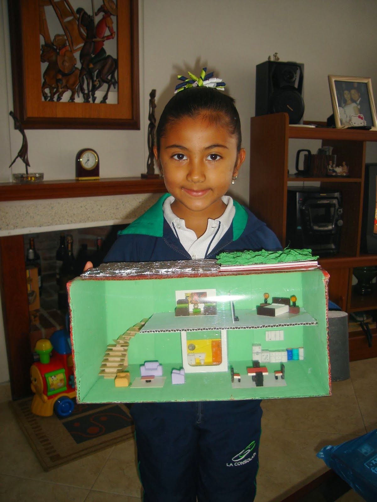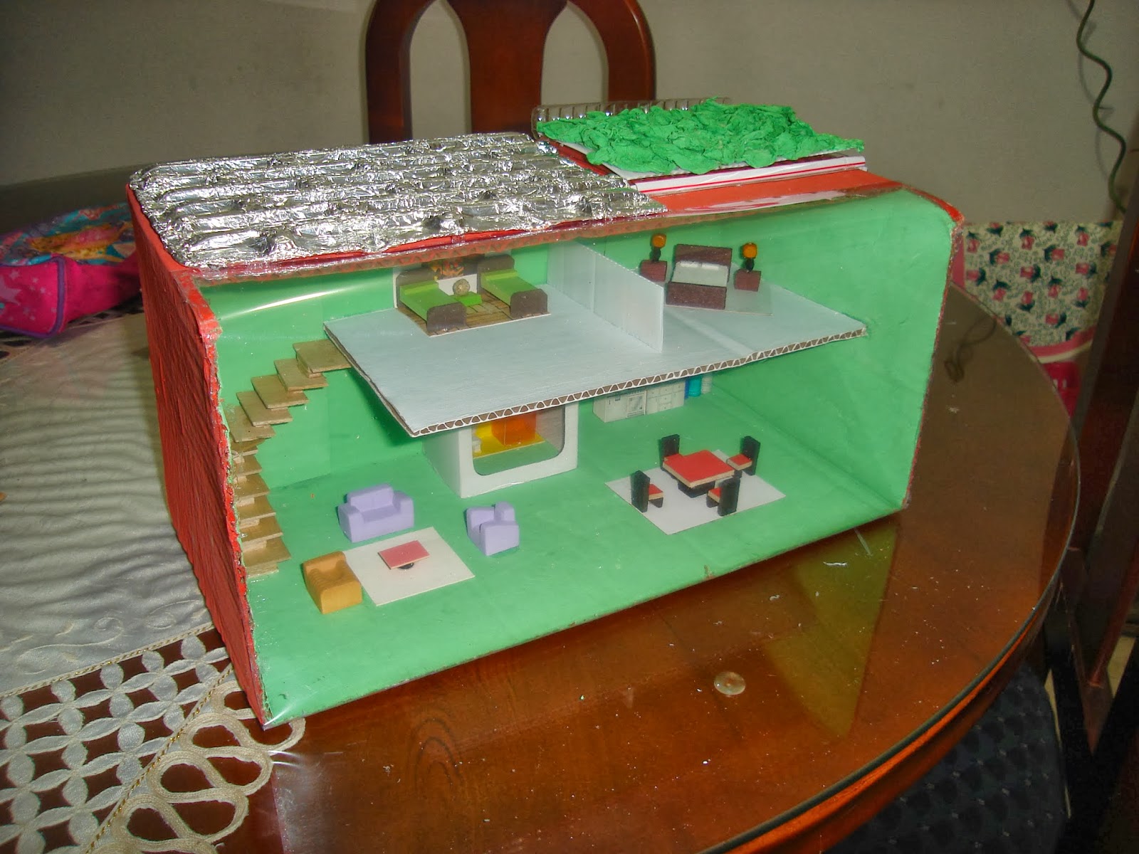 La maqueta de la casa ecológica utiliza materiales reciclables. Una caja de cartón sirve para los cimientos, la estructura y las paredes de la casa. La lámina de acetato cubre una de las paredes de la casa, para mostrar la casa por dentro. Uno de los moldes es cubierto con papel aluminio para servir como el panel solar. El otro molde es cubierto con algodón para simular las plantas; este molde tiene canales que se conectan con los pitillos. Estos pitillos son la tubería que lleva el agua filtrada por las plantas hacia la caneca recolectora. El tubo de cartón actúa como caneca. El resto de los accesorios se utilizan para el mobiliario de la casa: Sala, Dormitorio, Baño y Cocina. Por ejemplo, pintamos las tapas de botella para que queden como las canecas de basura ecológicas (Vidrio, Reciclable, Orgánicos, Otros).